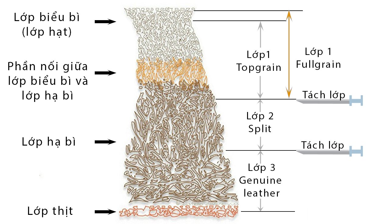 Tấm trên gọi là da lớp 1 (fullgrain leather hoặc top grain leather).
